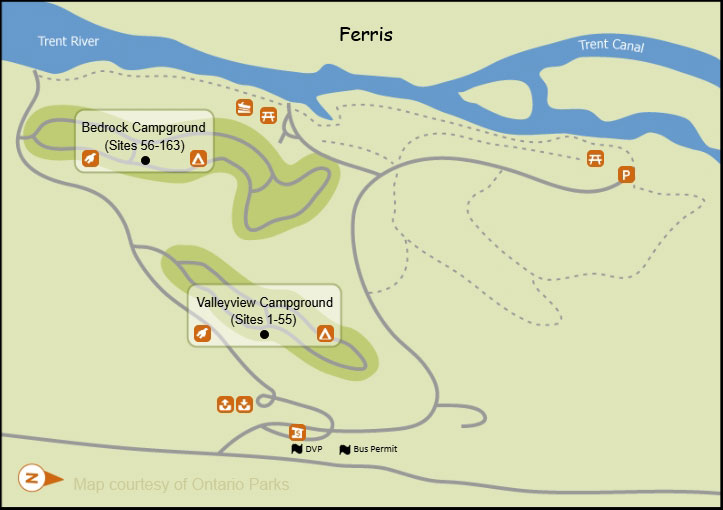 Ferris offers some of the most spacious car sites in the Ontario Parks ecosystem. Located near wooded hills and fields beside the Trent River. There is a waterfall and scenic bluffs. This Ontario Park is characterized by kilometers of old dry-stonewall fencing. With a selection of spacious wooded and open sites, spectacular vistas of the Trent River valley, this Ontario park is indeed a place to visit. A list of amenities and things To-Do at
